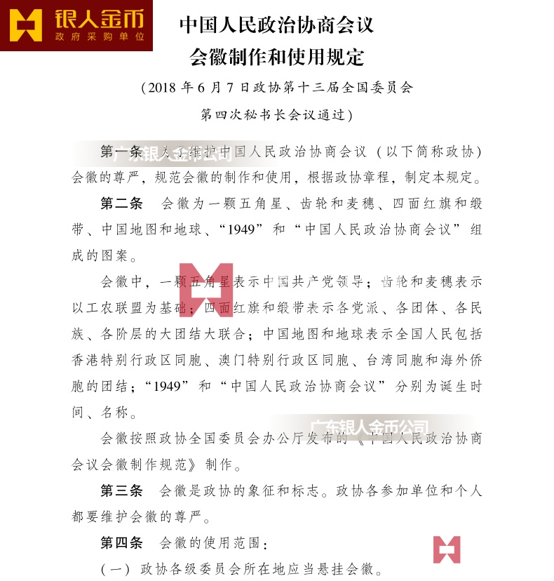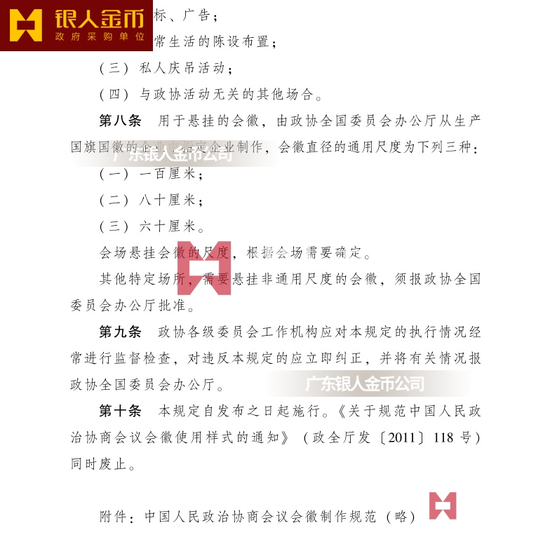 第十條 本規(guī)定自發(fā)布之日起施行?!蛾P(guān)于規(guī)范中國(guó)人民政治協(xié)商會(huì)議會(huì)徽使用樣式的通知》(政全廳發(fā)[2011]118號(hào))同時(shí)廢止。