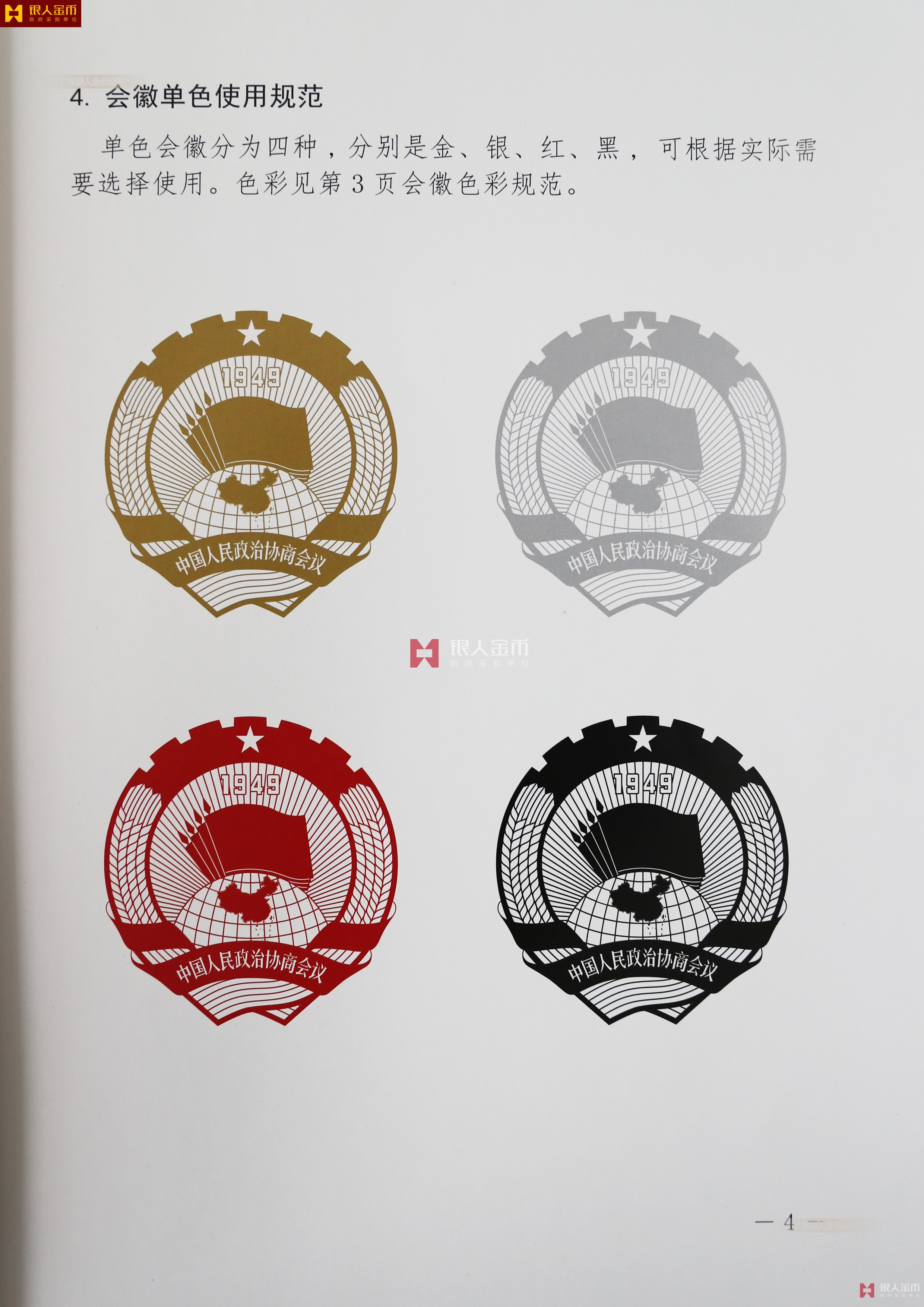 單色會(huì)徽分為四種,分別是金、銀、紅、黑,可根據(jù)實(shí)際需要來(lái)選擇使用。
