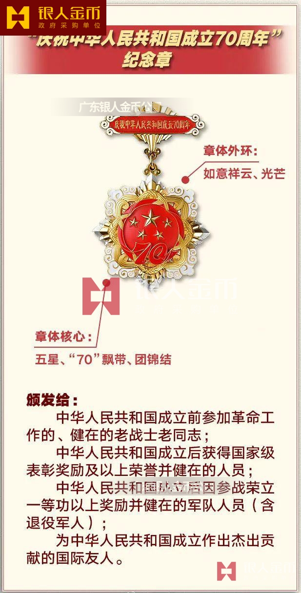 表彰獎勵的獲得者也能享有一定的待遇,獎勵層級越高,有關(guān)待遇越好。當(dāng)然,與勛章和榮譽稱號獲得者是無法媲美的,也無法記載于功勛薄之中。 第四種榮譽是“紀(jì)念章”。紀(jì)念章不屬于表彰,而是一種榮譽性的紀(jì)念,重在精神鼓勵,不享有額外的待遇。 紀(jì)念章主要頒發(fā)給參與特定時期、特定領(lǐng)域重大工作的全體個人,有國家級紀(jì)念章和省部級紀(jì)念章兩類。 最近幾年頒發(fā)的國家級紀(jì)念章有“慶祝新中國成立70周年紀(jì)念章”、“光榮在黨50年紀(jì)念章”、“抗美援朝出國作戰(zhàn)70周年紀(jì)念章”等等。