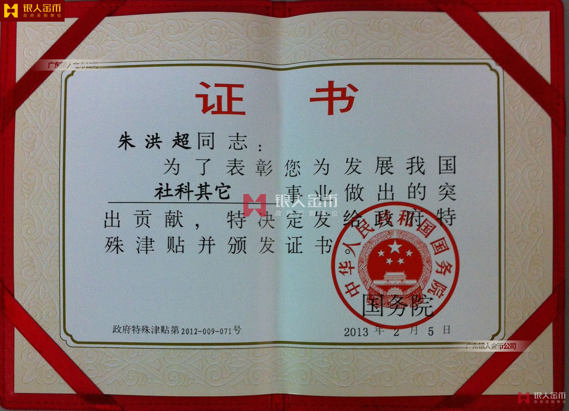 中華人民共和國國務院政府特殊津貼證書(圖)-【廣州銀人紀念章證章廠家有限公司】