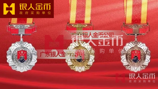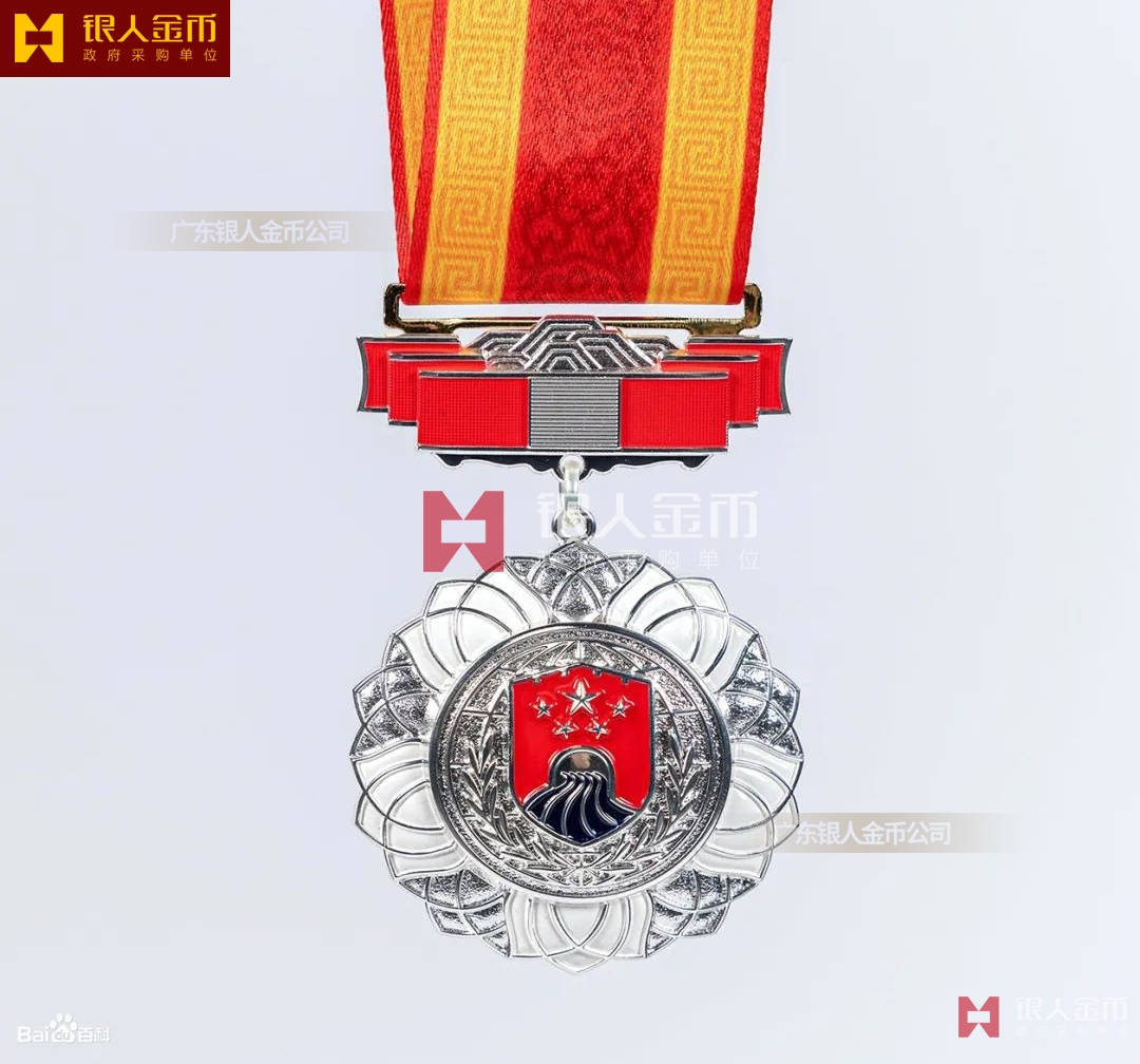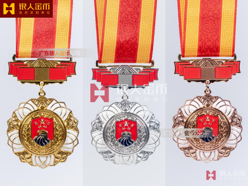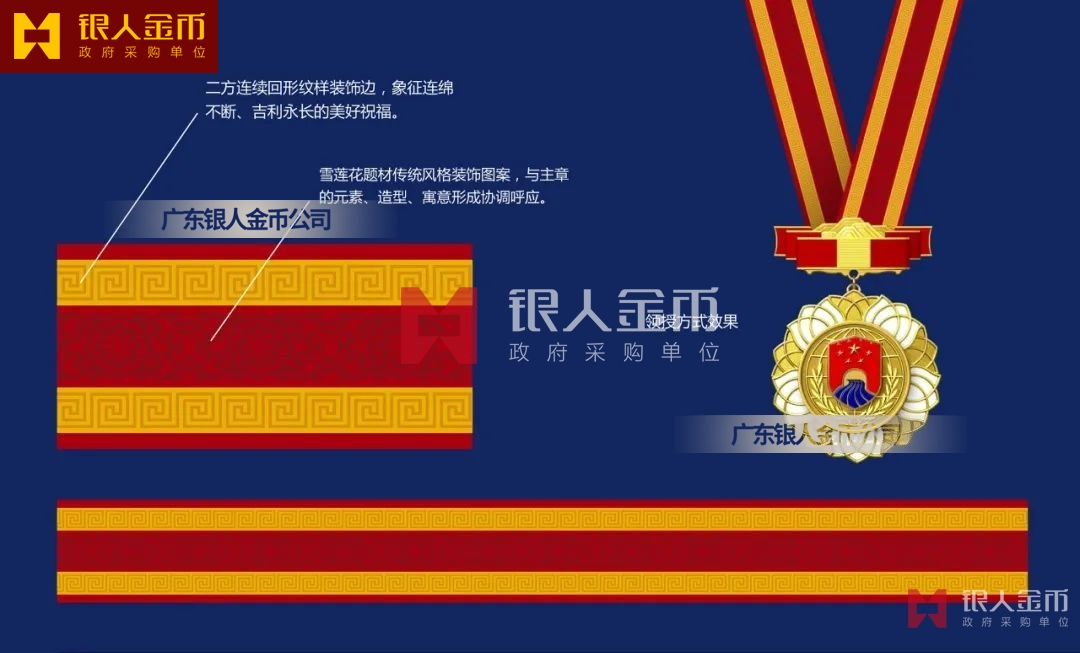 【產(chǎn)品】勛章由飄帶、獎?wù)掠缮椒?、紀(jì)念章由如意等元素構(gòu)成,金銀銅色條分別代表戍邊工作年限累計滿30年、20年、10年。