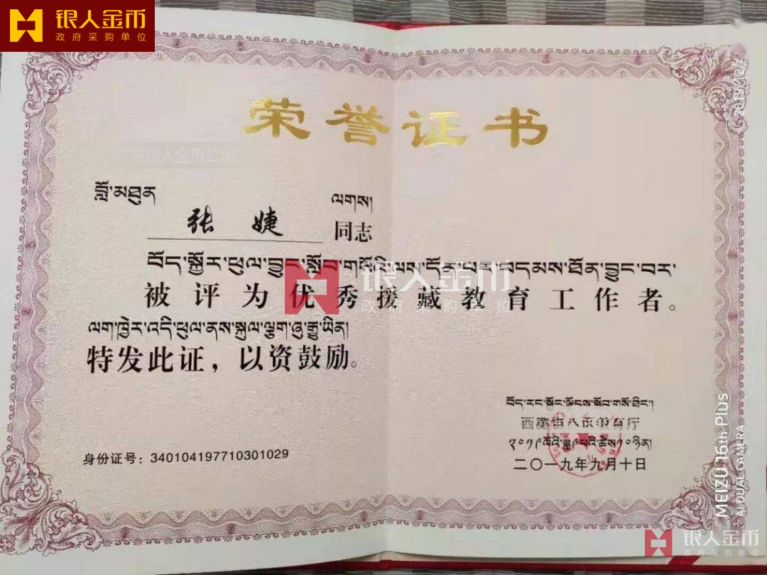 西藏自治區(qū)教育廳頒發(fā)優(yōu)秀援藏教育工作者獎(jiǎng)牌獎(jiǎng)?wù)伦C書