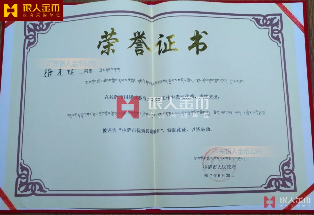 西藏拉薩市政府頒發(fā)拉薩市優(yōu)秀援藏教師獎(jiǎng)牌獎(jiǎng)?wù)伦C書