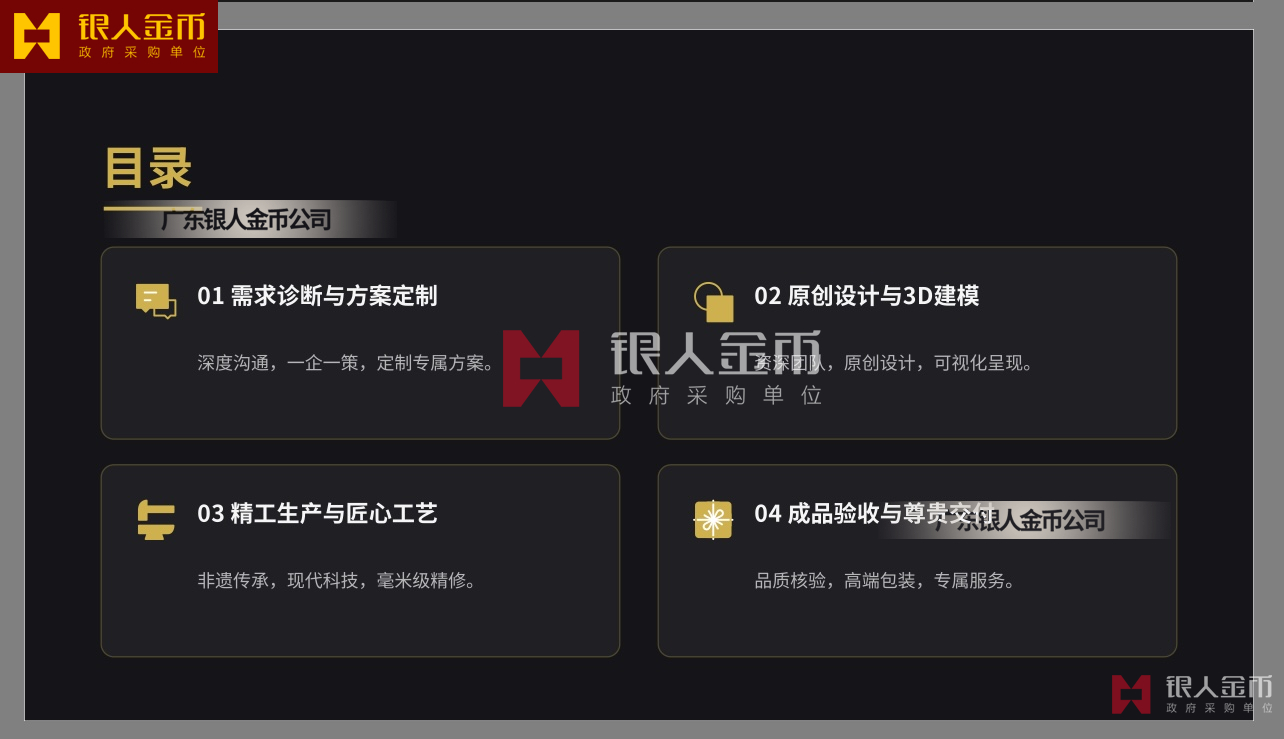 針對(duì)高端客群對(duì)獨(dú)特性的追求,提供深度的個(gè)性化定制服務(wù).基于客戶需求,結(jié)合黃金制品與企業(yè)文化元素,定做獨(dú)一無(wú)二的專屬珍品,極大提升了企業(yè)的價(jià)值感和尊崇感!