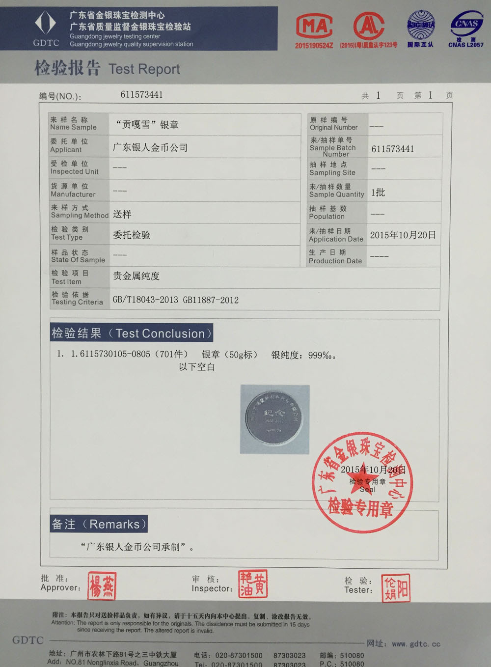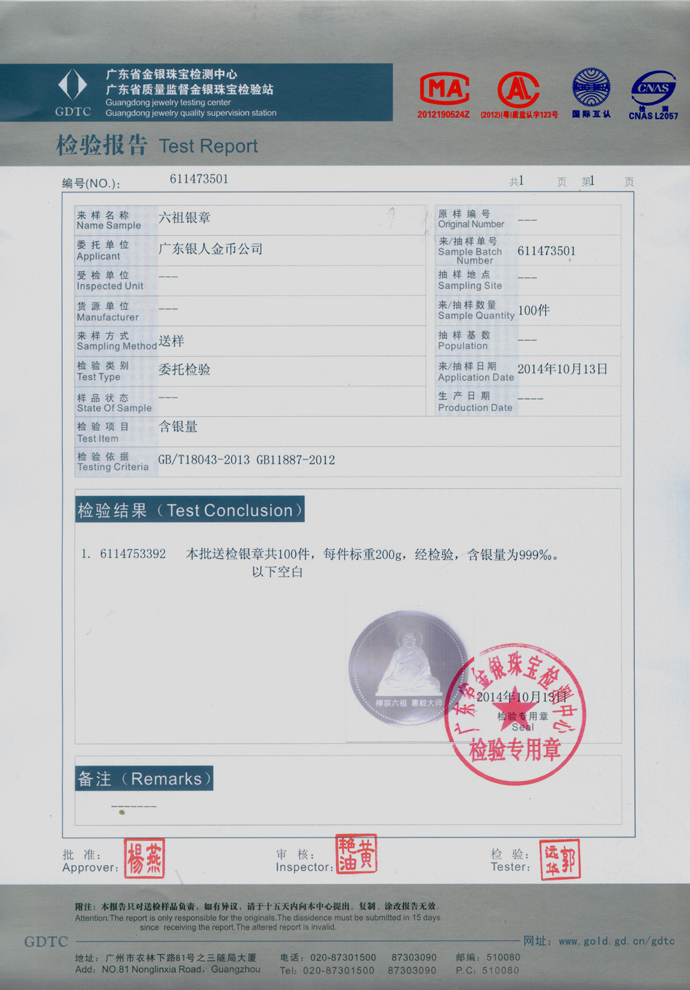 廣東省質(zhì)監(jiān)白銀純銀紀念幣章檢驗報告