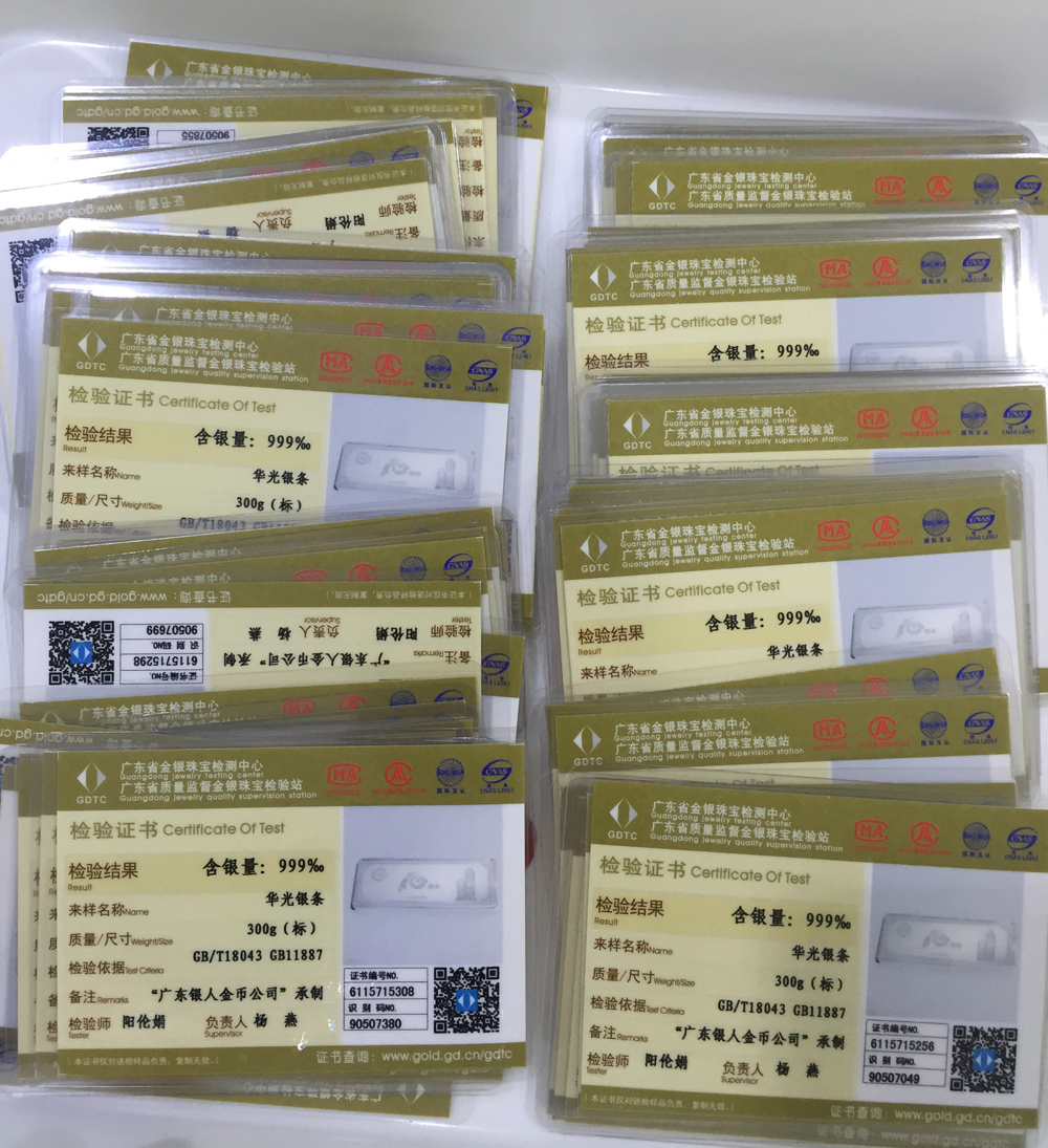 廣東省質(zhì)監(jiān)局白銀質(zhì)量含銀量投資銀條銀磚檢測鑒定證書