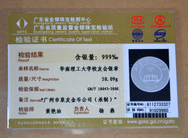 華南理工大學(xué)校友會(huì)紀(jì)念銀章檢測證書