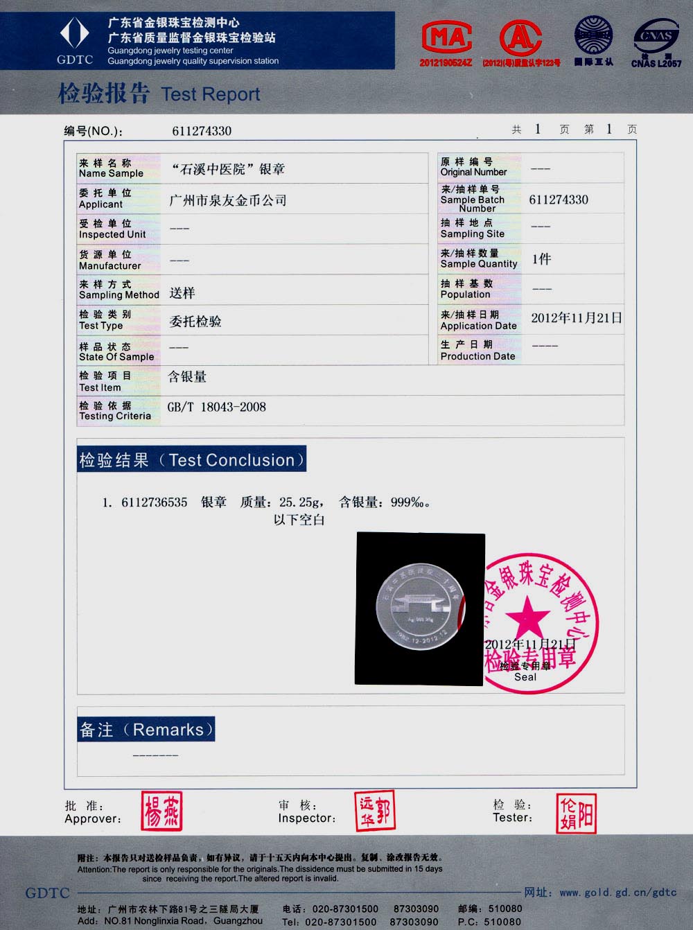 石溪中醫(yī)院成立30周年純銀紀(jì)念幣檢測報(bào)告