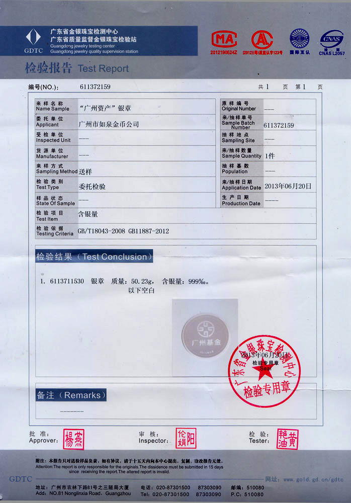 廣東省質(zhì)監(jiān)金銀制品檢測證書