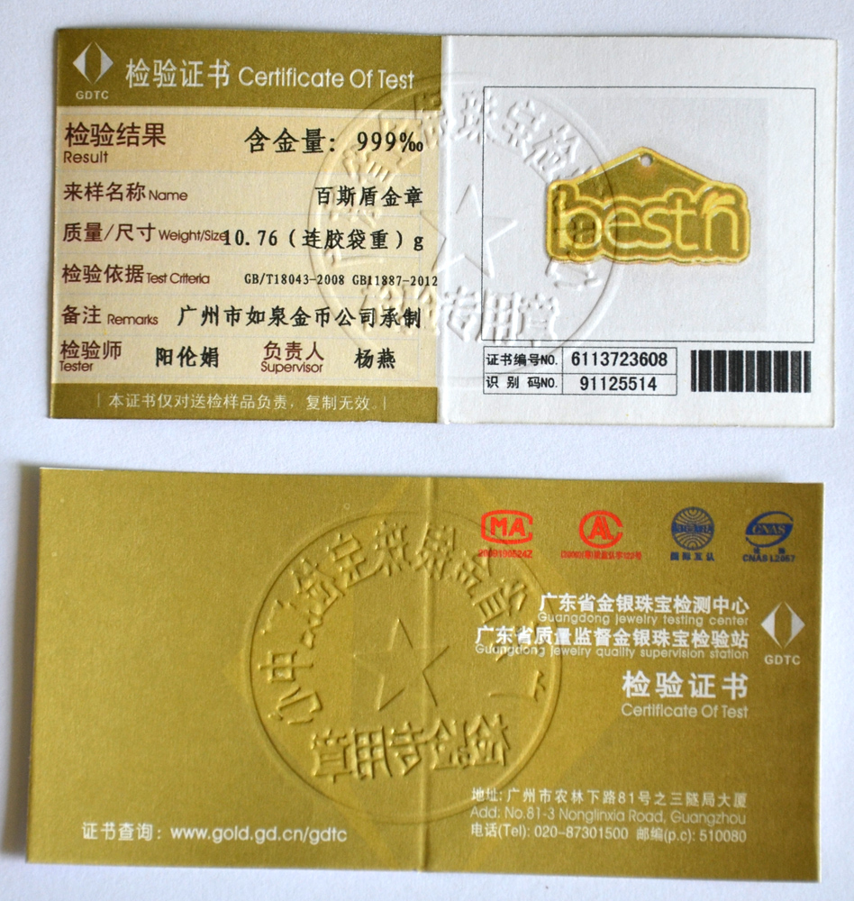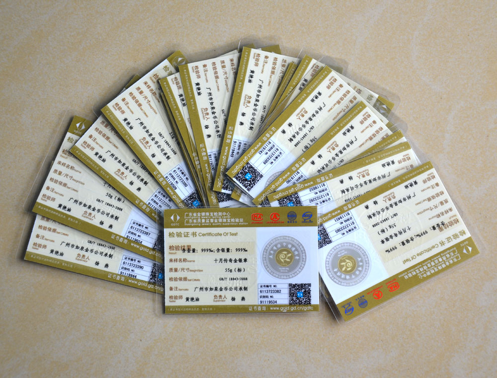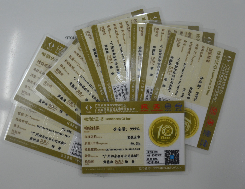 廣東省質(zhì)監(jiān)純金純銀檢測證書