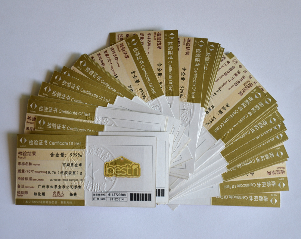 廣東省質(zhì)監(jiān)局黃金千足金純金鑒定證書
