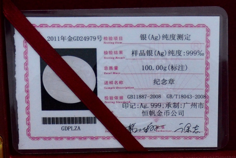 廣東省質(zhì)監(jiān)純銀999銀質(zhì)紀(jì)念幣檢驗證書