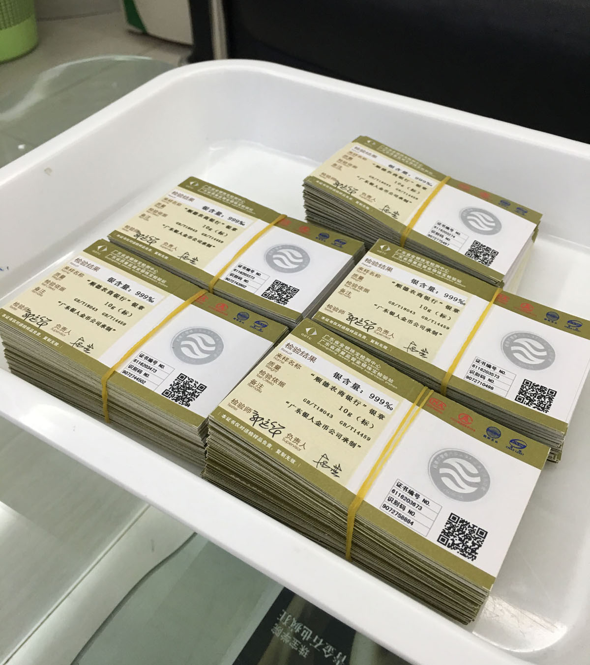 金銀紀(jì)念幣國(guó)家質(zhì)監(jiān)部門金銀含量檢測(cè)鑒定證書(shū)