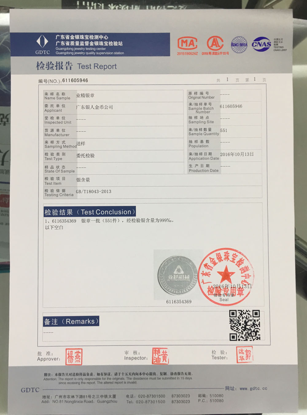 純銀銀牌含銀量國(guó)家權(quán)威機(jī)構(gòu)檢測(cè)證書(shū)
