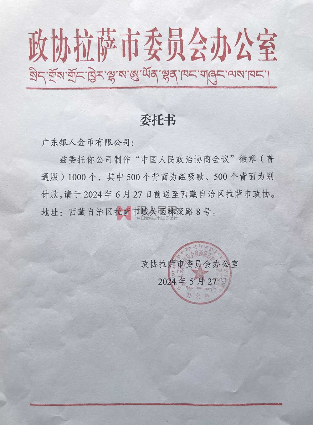 西藏拉薩市政協(xié)政協(xié)會徽生產(chǎn)制作定制制造公函
