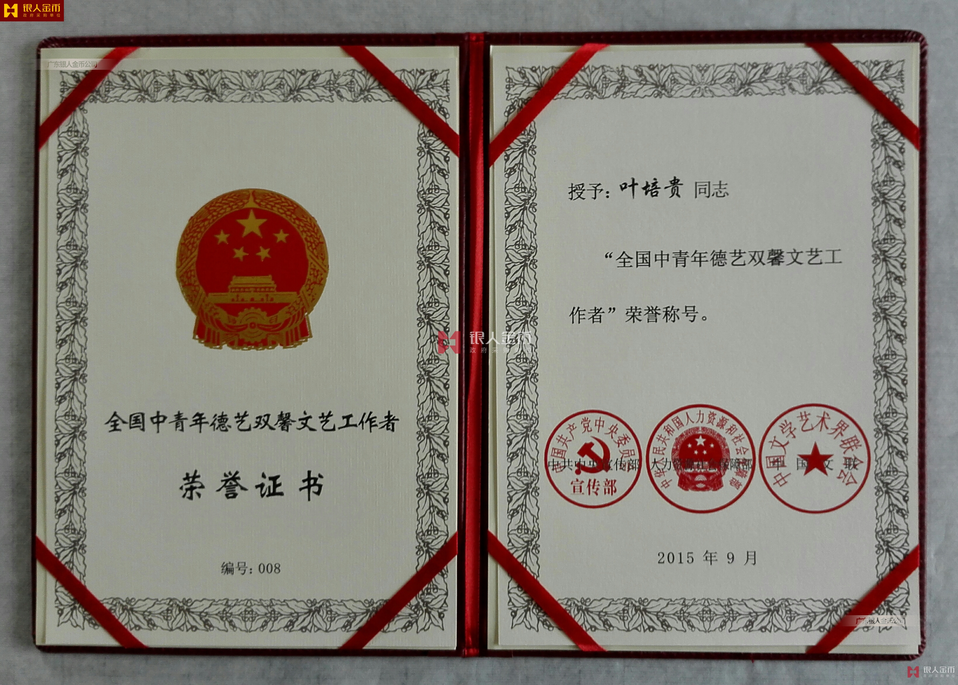 中宣部/人社部/中國文聯(lián)“全國中青年德藝雙馨文藝工作者”榮譽(yù)稱號(hào)獎(jiǎng)?wù)伦C書(圖)