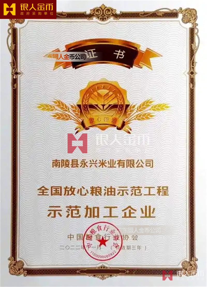 中國(guó)糧食行業(yè)協(xié)會(huì)全國(guó)糧油示范工程示范加工企業(yè)獎(jiǎng)牌證書牌匾銅牌(圖)