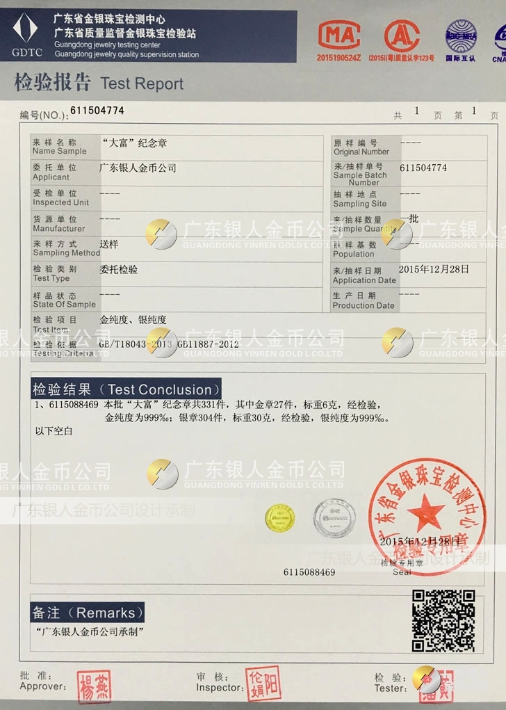 廣東銀人金幣公司承接客戶個(gè)性化定制的金銀幣、金銀章、金銀條、金銀牌、金銀盤(pán)均由國(guó)家質(zhì)監(jiān)部門(mén)、嚴(yán)格檢測(cè)、權(quán)威鑒定: