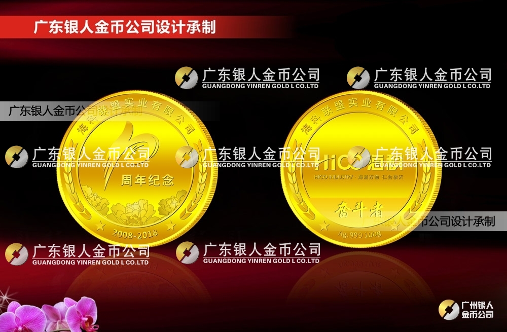 大連??坡?lián)盟主攻房地產(chǎn)、醫(yī)院、樓盤(pán)導(dǎo)向標(biāo)識(shí)、標(biāo)牌工程項(xiàng)目,委托我司設(shè)計(jì)制作公司10周年金銀幣定制。