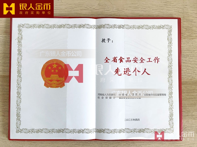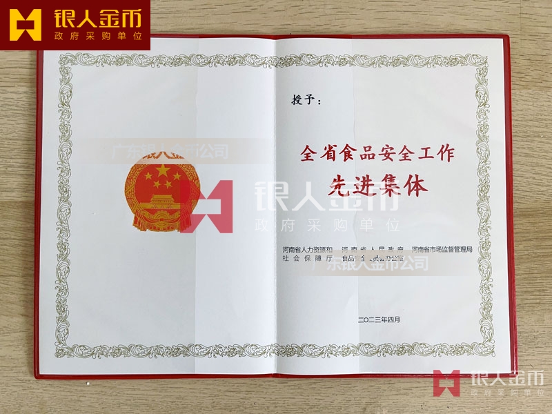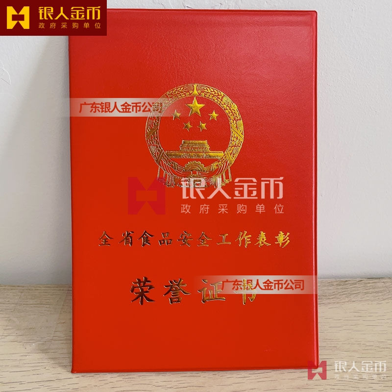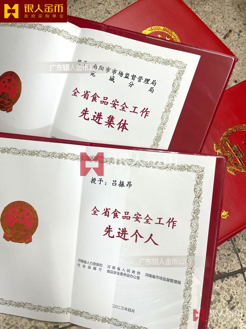 河南省政府表彰食品安全工作榮譽證書定制_食品安全工作先進集體稱號獎勵證書定做_食品安全工作先進個人稱號榮譽獎勵證書訂制